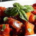 Retire o miolo e as sementes das berinjelas, corte-as em cubos, coloque-os em um bolwl, misture-os com sal, deixe descansar por 30 minutos e em seguida, lave escorra e seque bem.